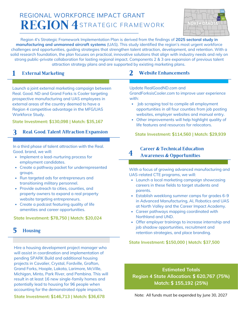 - External Marketing: Launch a joint external marketing campaign between Real. Good. ND and Grand Forks is Cooler targeting prospective manufacturing and UAS employees in regions of the country where Region 4 holds a competitive advantage, as identified in the MFG/UAS Workforce Study.