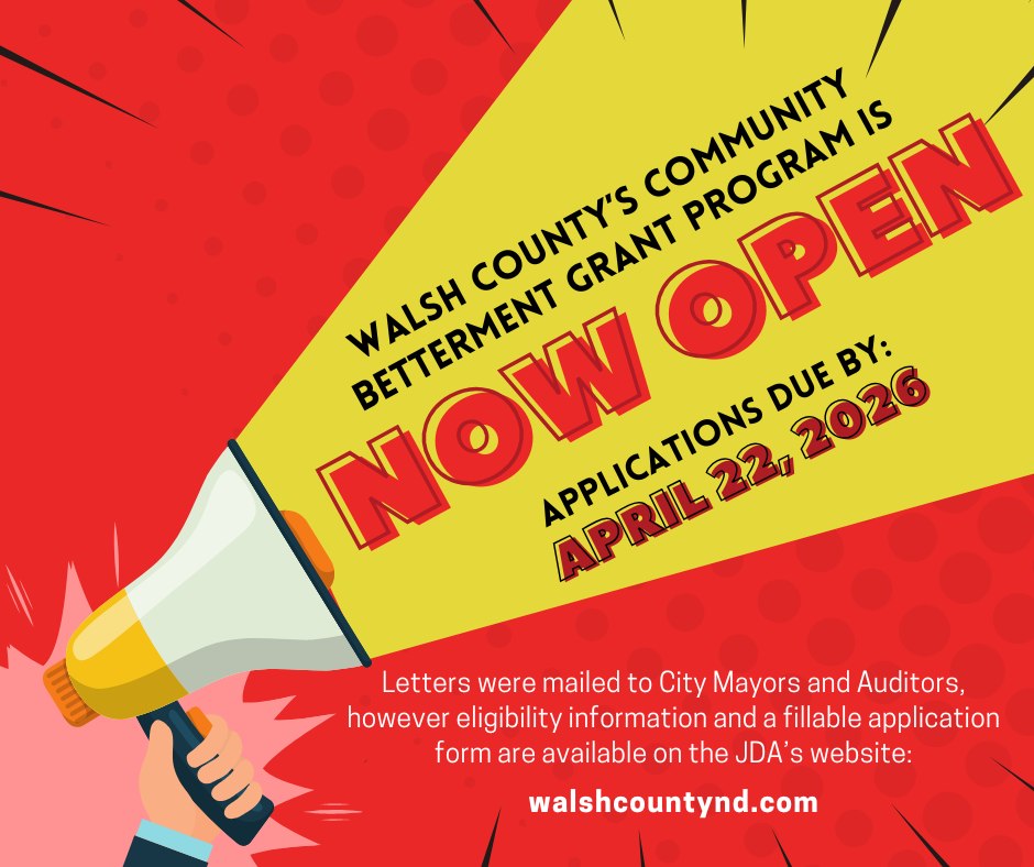 The 2026 Walsh County Self-Help Grant Program is now open. Applications are being accepted until April 22, 2026. The purpose of the program is to support community betterment projects in Walsh County cities using County funds. The program is managed by the Walsh County JDA on behalf of the County.